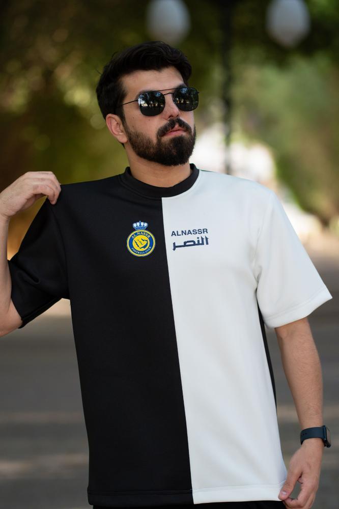 تيشيرت نادي النصر يتميز بتصميم أنيق وعصري يعكس روح الفريق العريق والانتماء الرياضي بكل فخر. يأتي بلون أسود بإنحناء مائل أبيض على الصدر يحمل شعار النادي ” بطباعة واضحة وأنيقة.