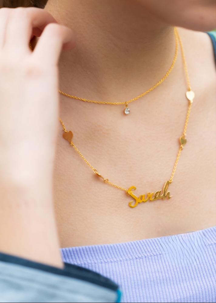 تصميم جذاب: تصميم سلسال بالاسم مطلي بالذهب أو الفضة مع قلوب تضيف لمسة من الأناقة والرومانسية.