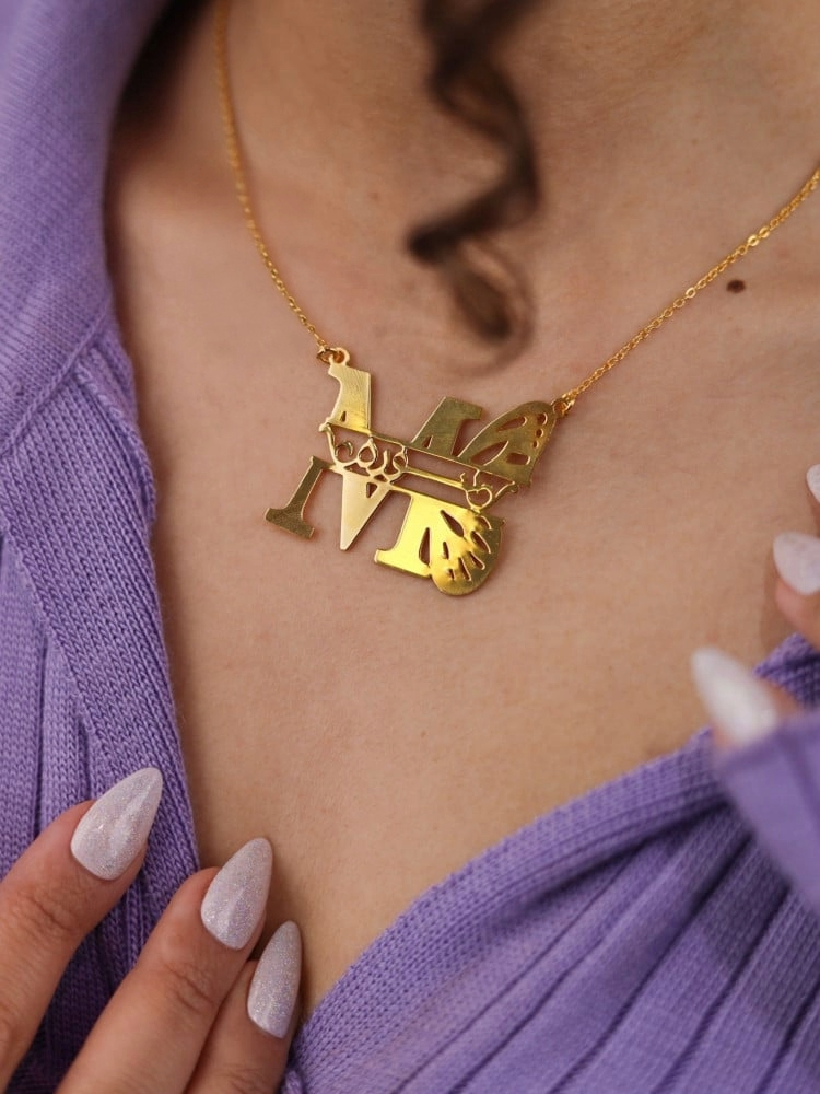 تستطيع تخصيص أي اسم أو كلمة (عربي أو إنجليزي) لتكون جزءًا من هذه القطعة الفنية، مما يجعلها تعبيرًا شخصيًا عن هويتك. متوفر بلونين جذابين: الذهبي المطلي بعيار 21 قيراط والفضي المطلي، مما يضمن لك إطلالة رائعة تناسب جميع المناسبات.