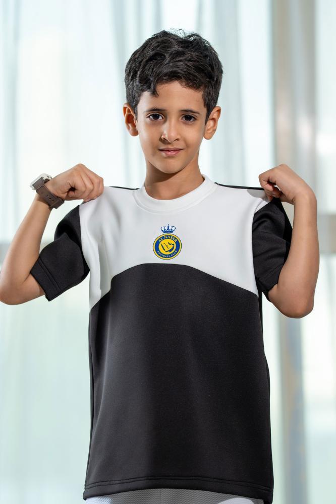 تيشيرت نادي النصر يتميز بتصميم أنيق وعصري يعكس روح الفريق العريق والانتماء الرياضي بكل فخر. يأتي بلون أسود مع شريط أبيض طويل على الصدر يحمل شعار النادي بطباعة واضحة وأنيقة.