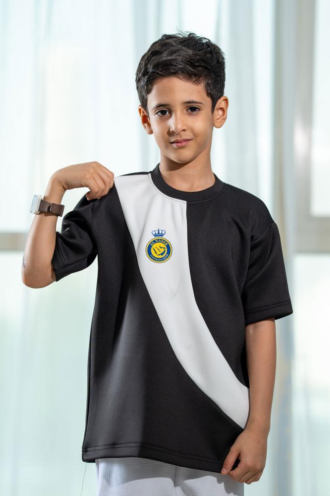 تيشيرت نادي النصر يتميز بتصميم أنيق وعصري يعكس روح الفريق العريق والانتماء الرياضي بكل فخر. يأتي بلون أسود مع شريط أبيض طويل على الصدر يحمل شعار النادي بطباعة واضحة وأنيقة.